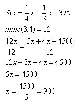 3) Uma pessoa quer construir uma casa que ocupará 1/4 de seu terreno, sendo que 1/3 será reservado para o jardim. Sabendo que ainda sobrará uma área de 375m², qual é a área total do terreno?